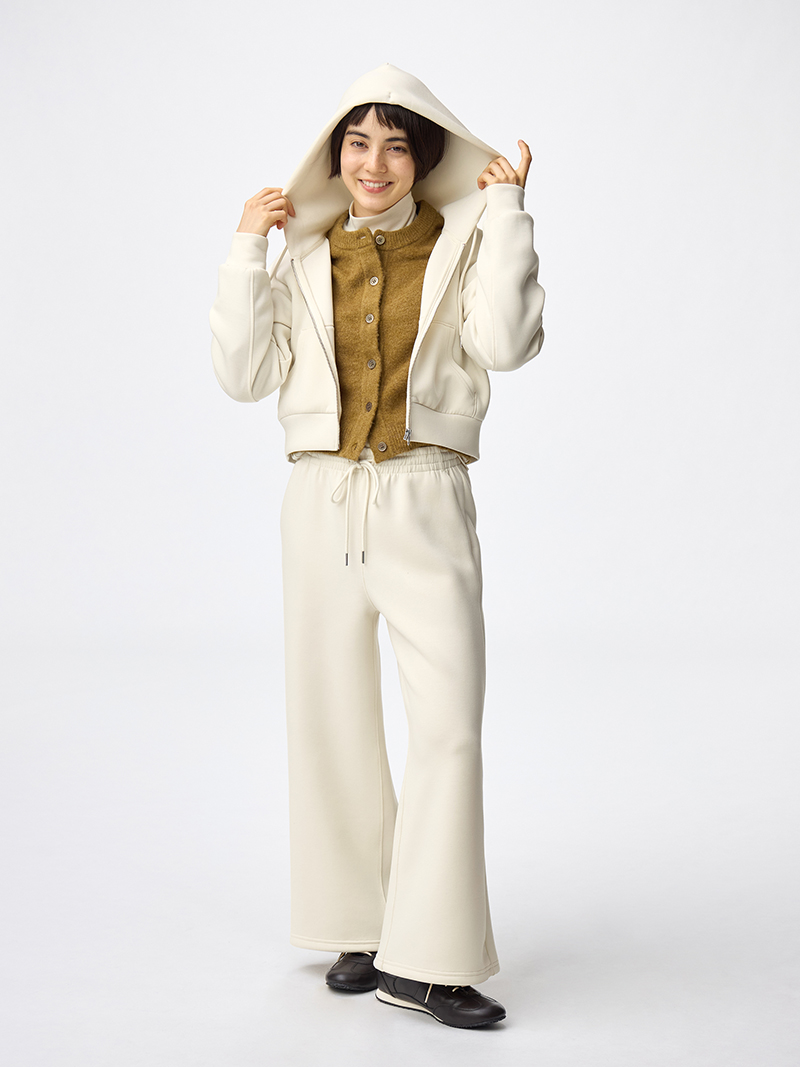 起毛加工した糸を編み立てた1着で、やわらかくて着心地がよく、チクチクしにくいやさしい風合いが特徴です。ほどよくコンパクトなサイズ感で、カーディガンとしてはもちろん、ボタンを閉じてトップス使いも可能なアイテムです。